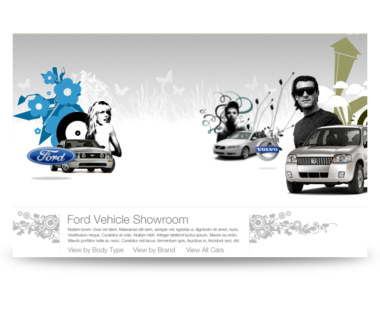Concept designs for an experiential online vehicle showroom. Versions include body types represented by their own mini-sites within the landscape of the showroom (with illustrations designed to enhanche the buyer's perception of those vehicles) and an early "calculator-like" browsing method that favors the tools over the experience.