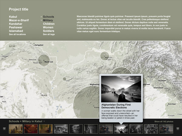 November 11 asked me to design an online image viewer to collect and organize photographs made by photojournalists in the area. The site lets photographers upload their photos and tag them by location.